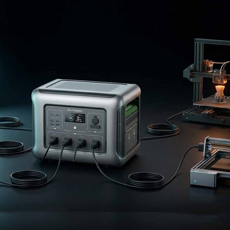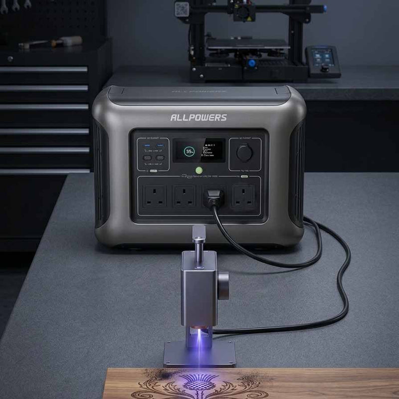 For most desktop 3D printers in the UK market, the R1500 LITE (1056Wh / 1600W) is an ideal choice. It can power common printers like Bambu Lab, Creality, Prusa, or Elegoo during outages, garage workshops, or mobile events.