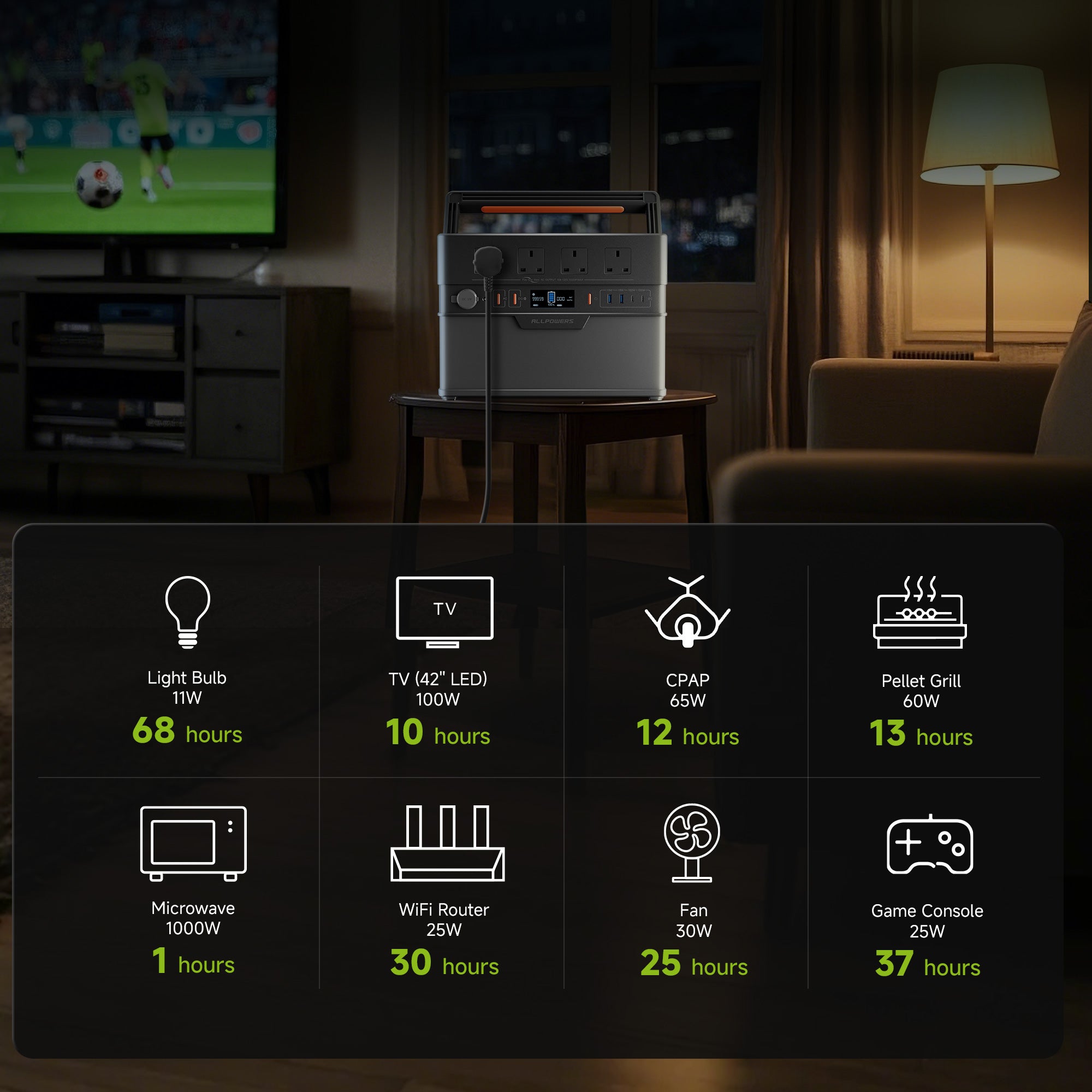 For example, if the S1500 Plus is used to power a 120W Portable Cooler, the runtime would be 1092Wh x 86% ÷ 120W ≈ 7.8 hours.